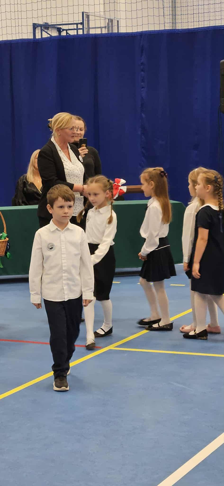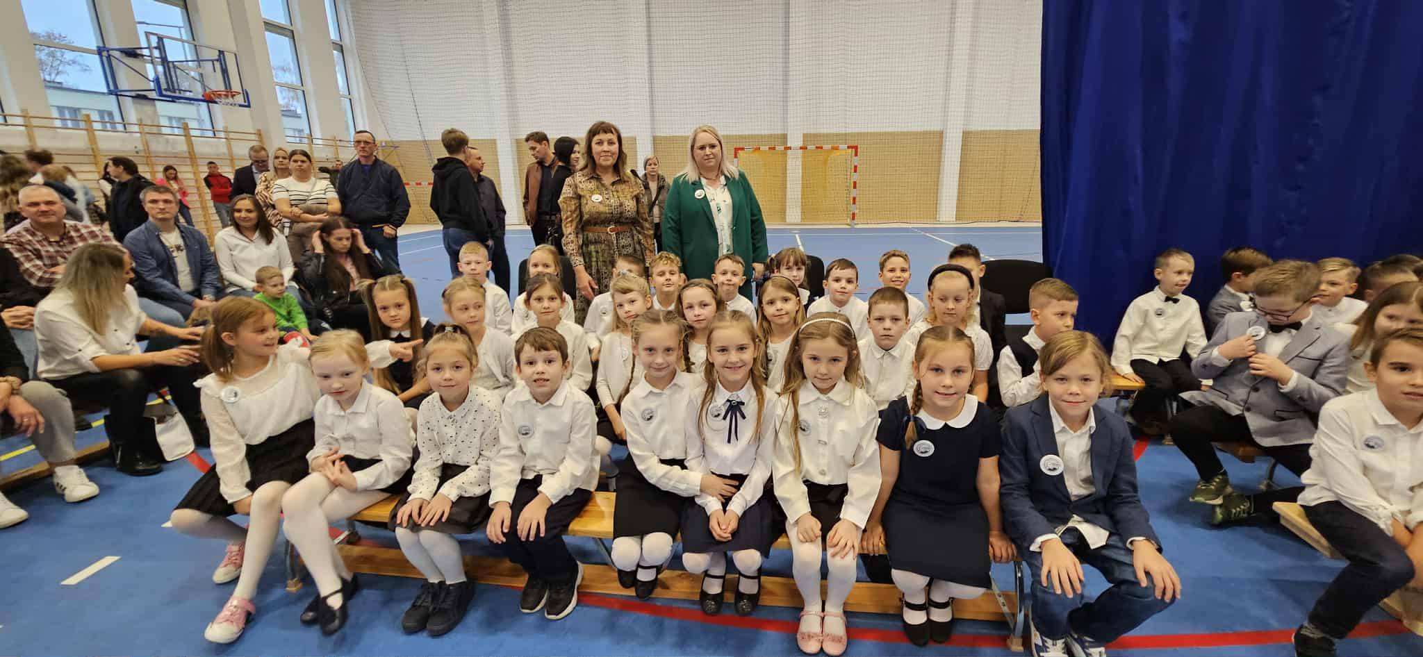 Na hali sportowej, udekorowanej w barwy szkolne, przy dźwiękach radosnej muzyki, wkroczyły w pełnej gali wszystkie klasy pierwsze. Uśmiechy, eleganckie stroje i nieco tremy – wszystko to stworzyło niezapomnianą atmosferę tej chwili.