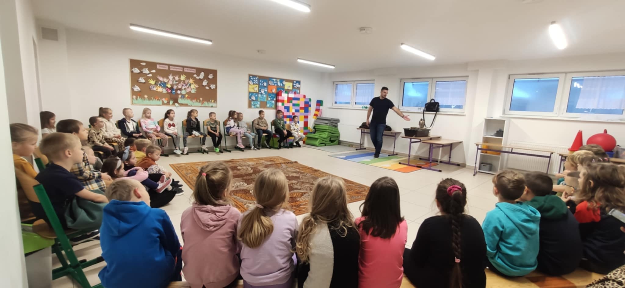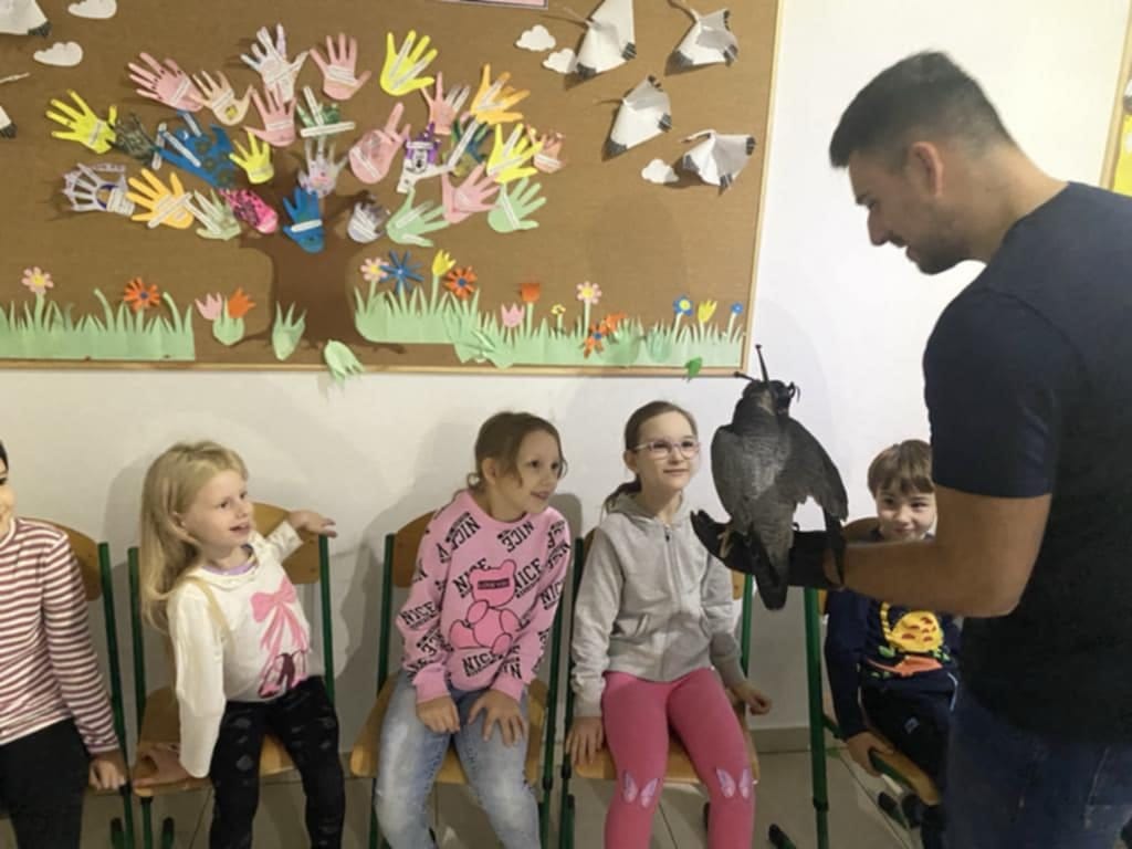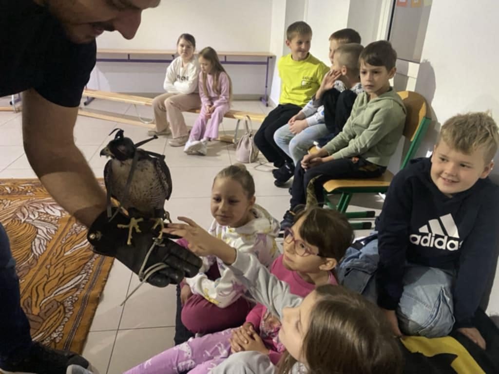 Pan Marcin z pasją opowiadał o swojej pracy z ptakami drapieżnymi, dzieląc się ciekawostkami na temat ich codziennych przyzwyczajeń, zachowań oraz niezwykłych umiejętności. Dzieci dowiedziały się również, w jakich sytuacjach wykorzystywane są ptaki takie jak sokół – m.in. w ochronie lotnisk czy przy zwalczaniu szkodników.