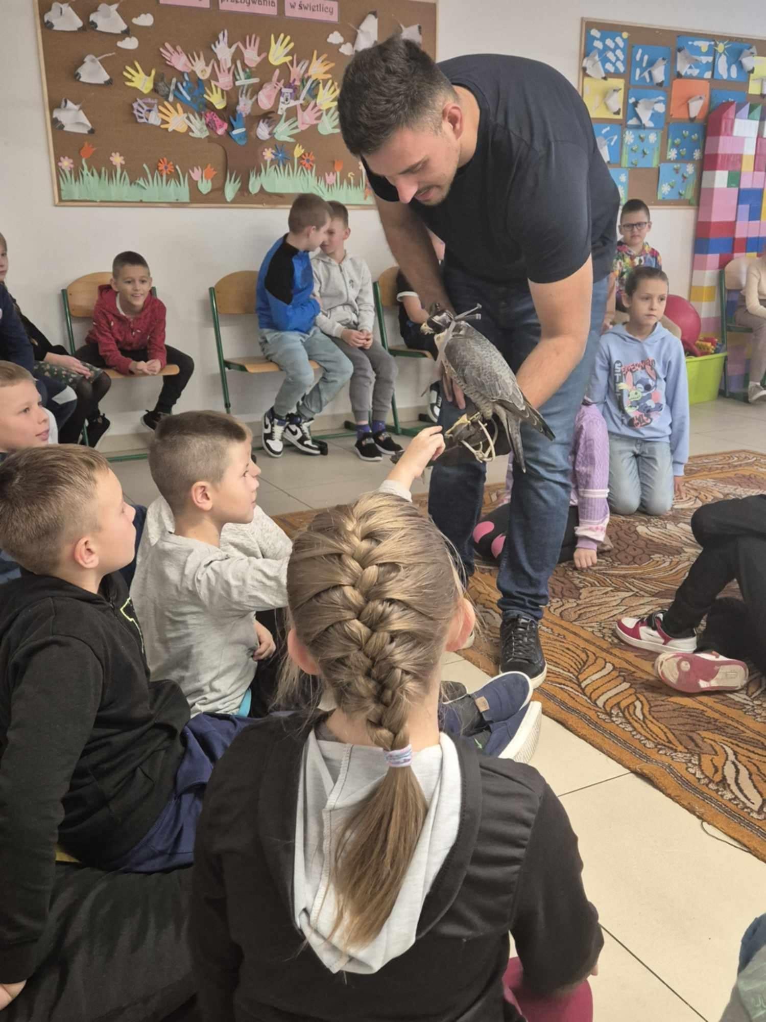 Uczniowie z wielką uwagą słuchali fascynujących historii i zadawali liczne pytania, na które Pan Marcin chętnie odpowiadał. Na zakończenie spotkania, pełni wrażeń, serdecznie podziękowali za możliwość poznania tak wyjątkowego ptaka oraz za interesującą lekcję przyrody, która na długo pozostanie w ich pamięci.
